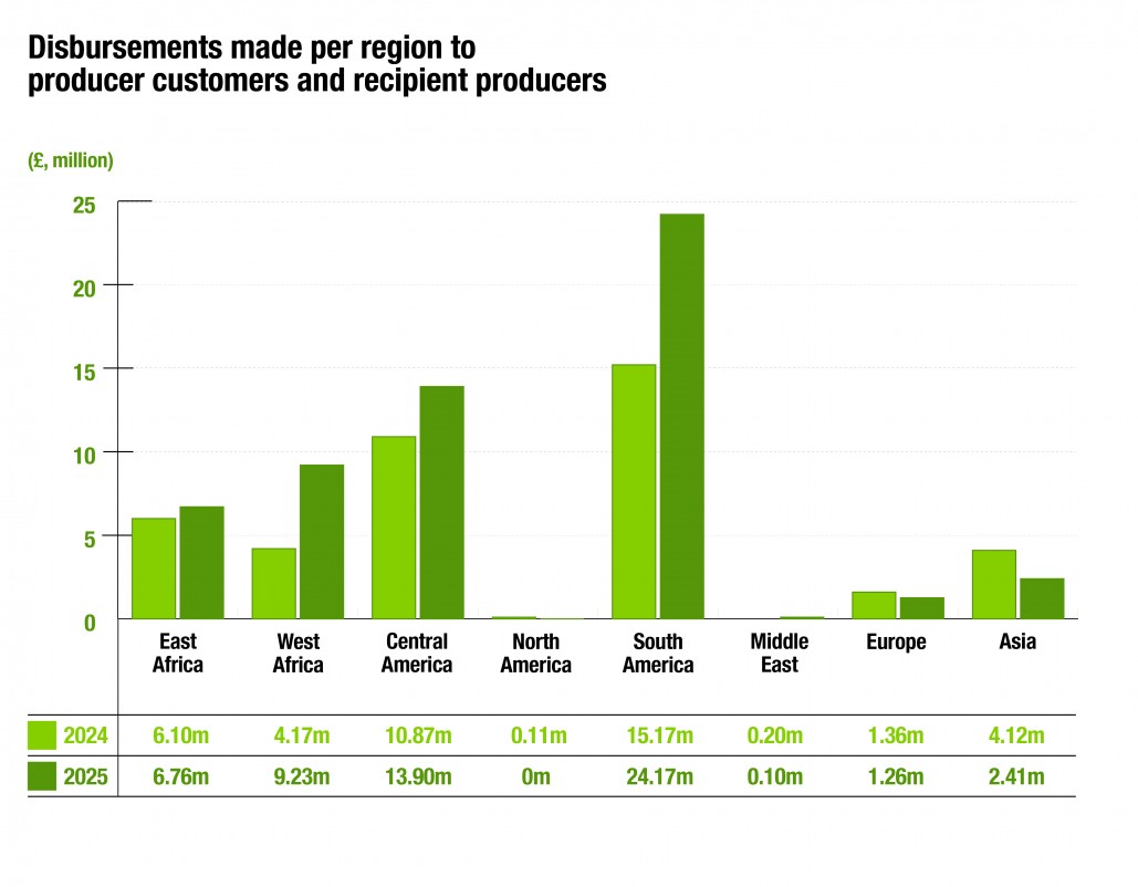 Total disbursements reached £57.95m, a 37% increase from £42.1m in 2024. Latin America contributed £12m of this increase, while East Africa grew by £660k. This marks a significant step forward in lending activity, reflecting the strengthening of our operational capacity and the growing trust of our customers.